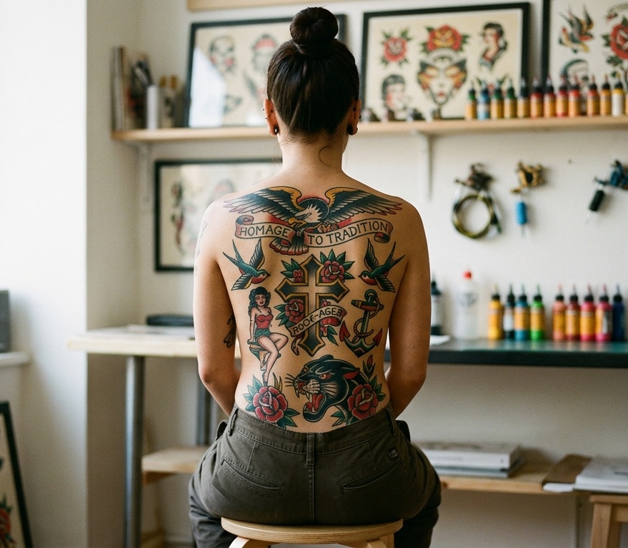 É um dos estilos mais clássicos, consolidado no Ocidente no início do século XX. Caracteriza-se por traços grossos, cores sólidas e limitadas (vermelho, verde, amarelo e preto) e temas como âncoras, caveiras, corações e marinheiros. A estética é simples, direta e altamente simbólica, com forte influência da cultura náutica e militar.